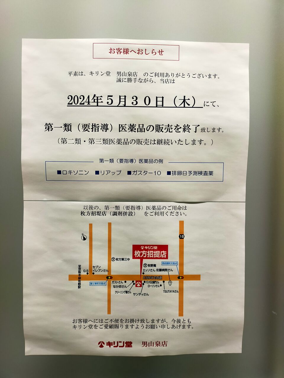 キリン堂男山泉店が第1類医薬品の販売を終了 2024年06月06日 ドラッグストア「キリン堂 男山泉店」が第1類医薬品の販売を終了しています。店頭のお知らせ↓お知らせによると、第1類医薬品の販売を終了したのは5月30日で、第2類・3類の医薬品の販売は継続。第1類医薬品を取り扱っている近隣の店舗は枚方招堤店になるとのこと。 < 前の記事次の記事 > コメント コメントフォーム 名前 コメント 記事の評価 リセット リセット 顔 星 情報を記憶 コメントを投稿する