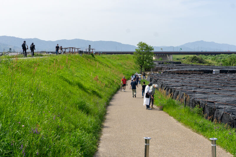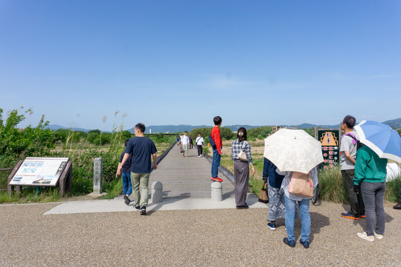 堤防を下りて流れ橋に向かう人の姿が続々。