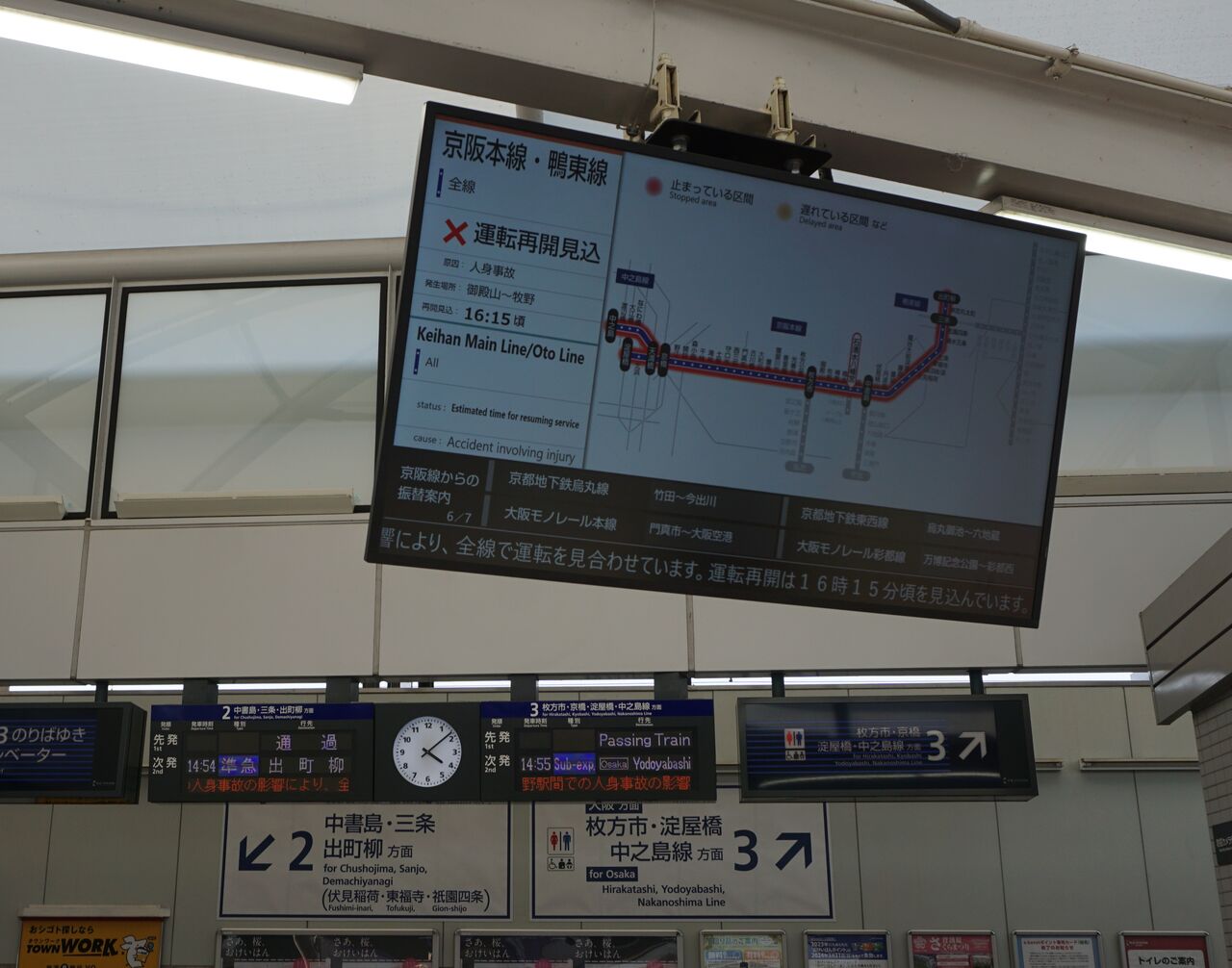 改札口で「京阪本線・中之島線・鴨東線が運転見合わせ」の案内がされていました。