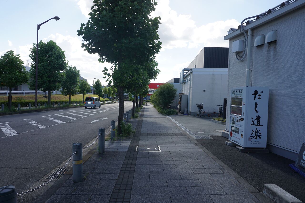 松井山手駅前の「だし道楽」の自動販売機が設置されているのは、商業施設「BRANCH(ブランチ)松井山手」の駐輪場横。次の交差点を右に曲がると、JR松井山手駅があります。